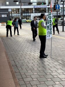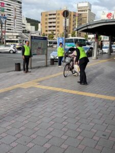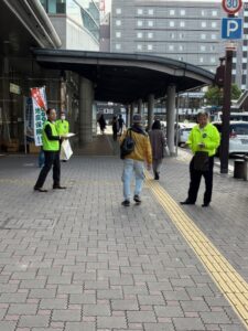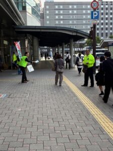 通勤・通学で行き交う皆さまに、チラシを配布し、地震保険の重要性や加入メリットをお伝えしました。